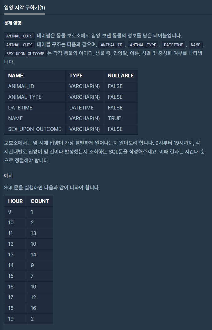 SELECT HOUR(DATETIME), COUNT(*) FROM ANIMAL_OUTS WHERE HOUR(DATETIME)>=9 AND HOUR(DATETIME)<=19 GROUP BY HOUR(DATETIME) ORDER BY HOUR(DATETIME);