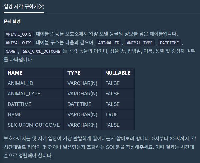 SELECT @H:=@H +1 AS HOUR, (SELECT COUNT(*) FROM ANIMAL_OUTS WHERE HOUR(DATETIME) = @H) FROM ANIMAL_OUTS WHERE @H<23;